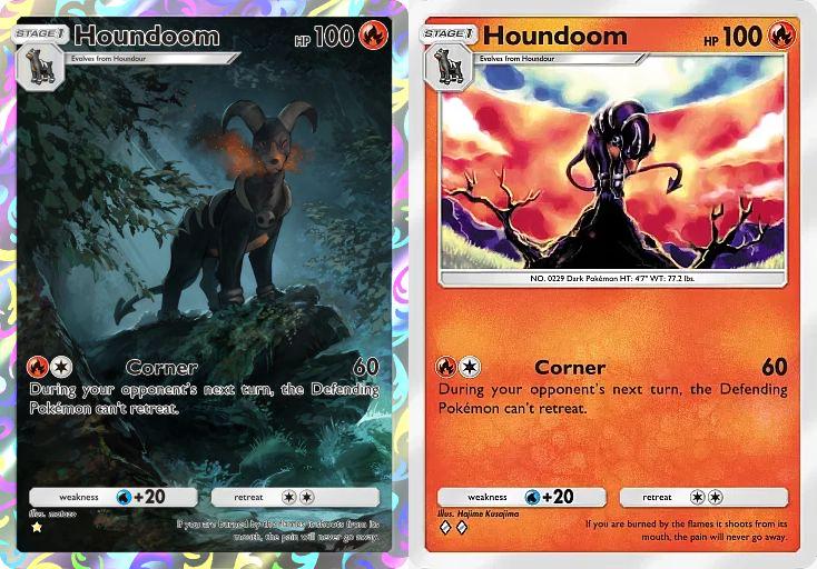 De full art versie toont Houndoom in een nachtelijk bos met vlammen uit zijn bek, terwijl de standaardversie de Pokémon hoog in een boom laat zien met een dreigende rode en blauwe lucht.